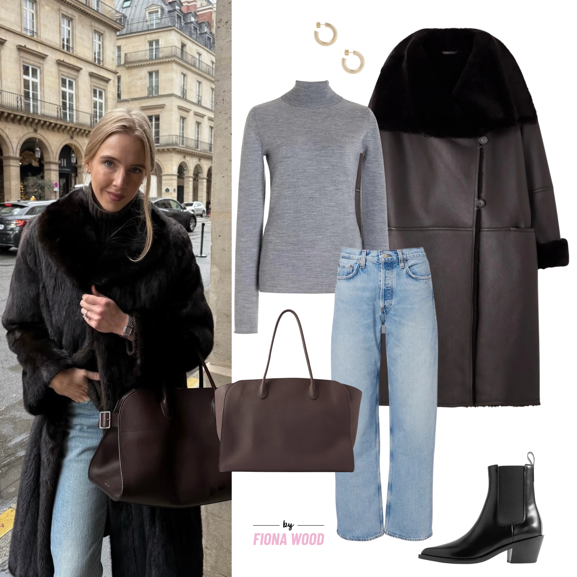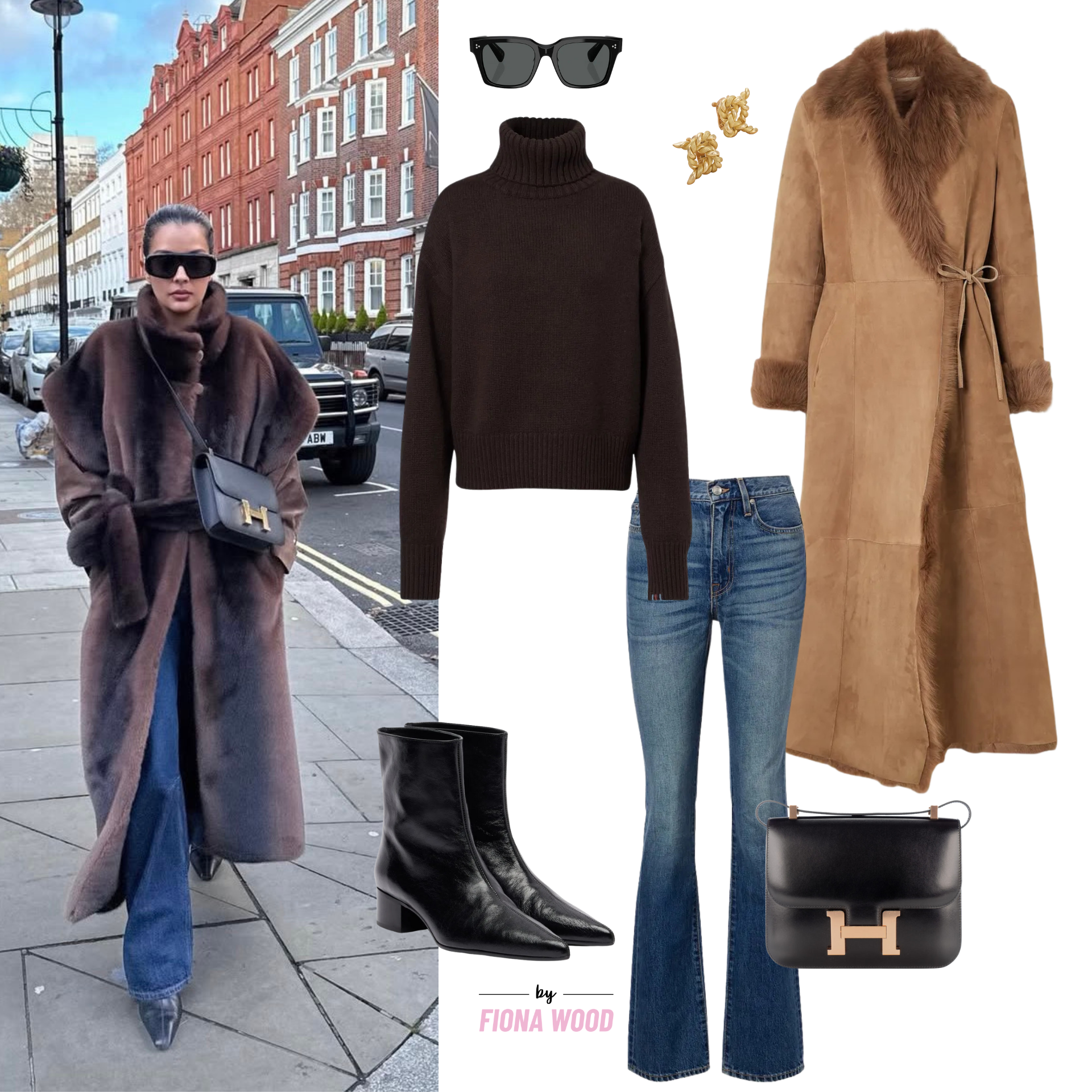 Incase you haven’t gathered, I’m a fan of a classic look, one that is wearable and timeless, and nothing is more timeless to me than a pair of flared jeans. These ones are SLVLAKE and more of a boot cut than a classic flare, but just flared enough to look cool over the Khaite Andee ankle boots. Coat wise, you have a variety of options here to recreate, and could go full fur or faux, but I really love the Nour Hammour shearling option, which can be brought out year after year, and always look put together but cool.