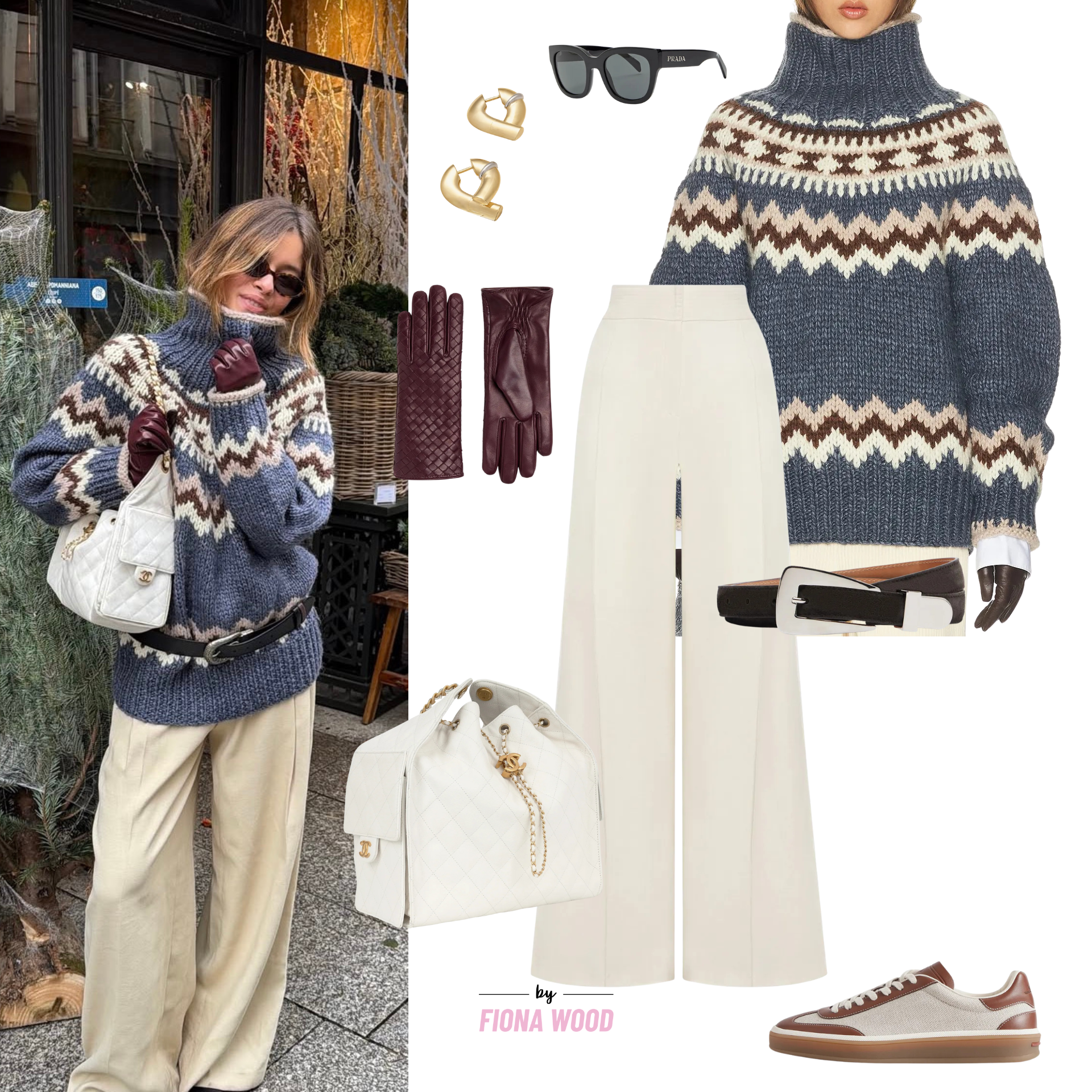 I love this Helsa arctic knit, and how cosy it seems, and am also sort of in love with the idea that influencers are styling what used to be the 80s ski-jumpers I desperately tried to avoid having to wear from my mothers wardrobe growing up. the belt gives it a bit of shape and the Andres Otalora trousers elevate the look into something Mayfair approved. Finishing touches include the now classic Chanel 25 bag and bordeaux leather gloves by Bottega Veneta.