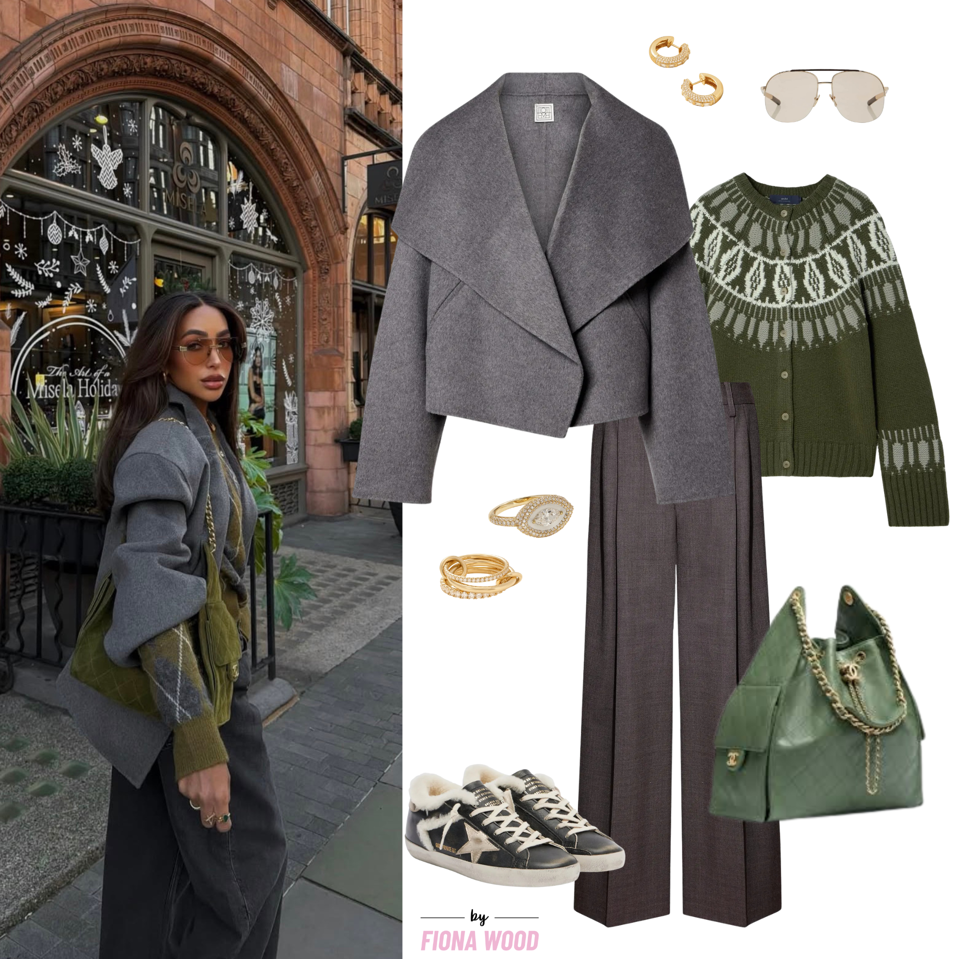 The Toteme wool jacket here creates an effortless, chic silhouette which I am really liking over chunky knitwear. I chose a green fair isle cashmere cardigan by a brand called ARCH4, and love how it is teamed with a pair of wide leg trousers, like these ones by Kallmeyer, but equally as cool would be a pair of wide leg jeans by Good American for example. Sunglasses and sneakers and some good must-have jewellery by Kamyen and Spinelli Kilcollin turn this otherwise simple look into something really luxe.