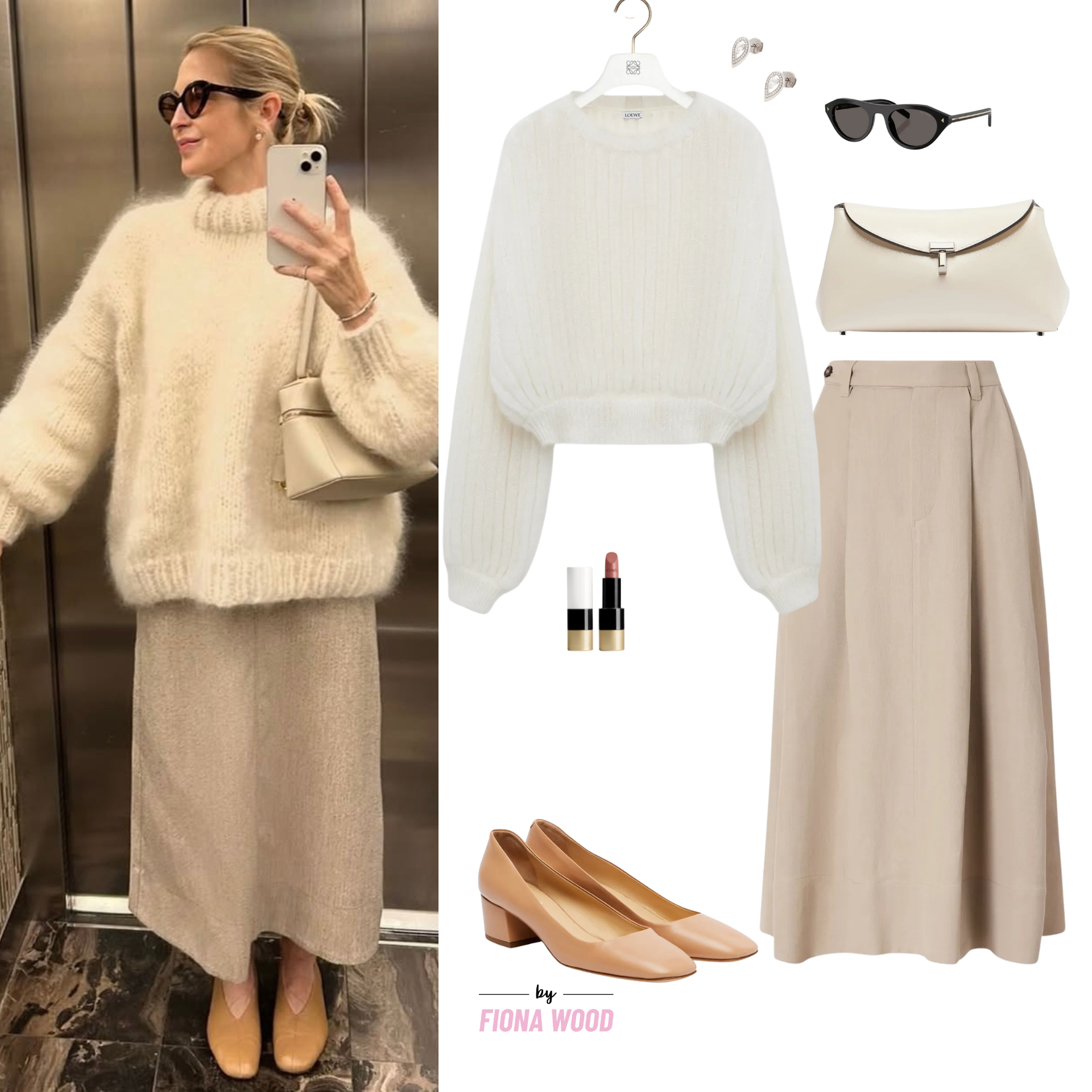 Kelly Rutherford has been serving looks for a while now, and as always I love her incredibly elegant take on winter whites with this mohair blend knit by Loewe and pleated twill skirt by Brunello Cucinelli. Shoes can be more edgy, or classic like these Gabriela Hearst Agathe pumps. I’ve chosen a Toteme clutch, because I’m really loving the shape at the moment, and am really enjoying the idea of a white version for winter, and of course my all time favourite Hermes lip balm- which I do not leave the house without!